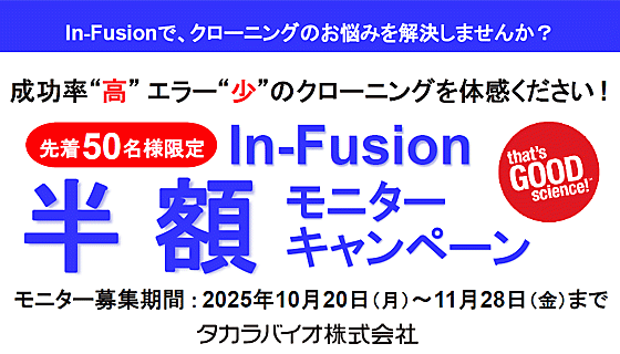 11/28まで!タカラバイオ「In-Fusion®」半額モニターキャンペーン
